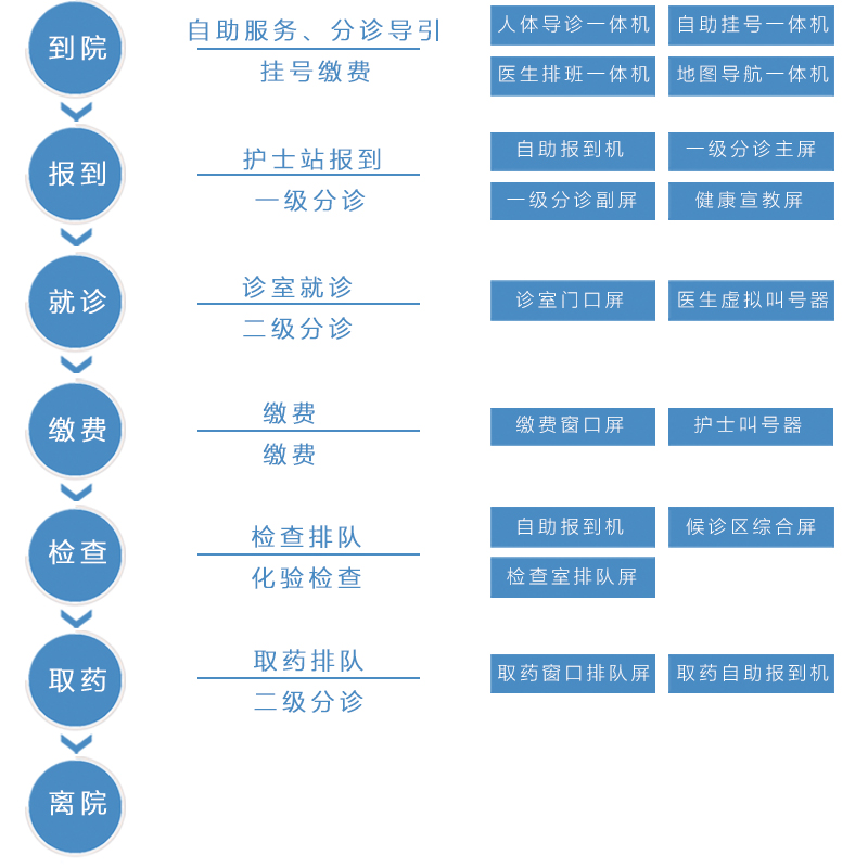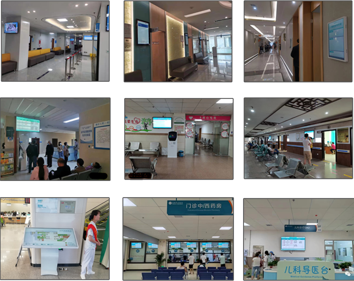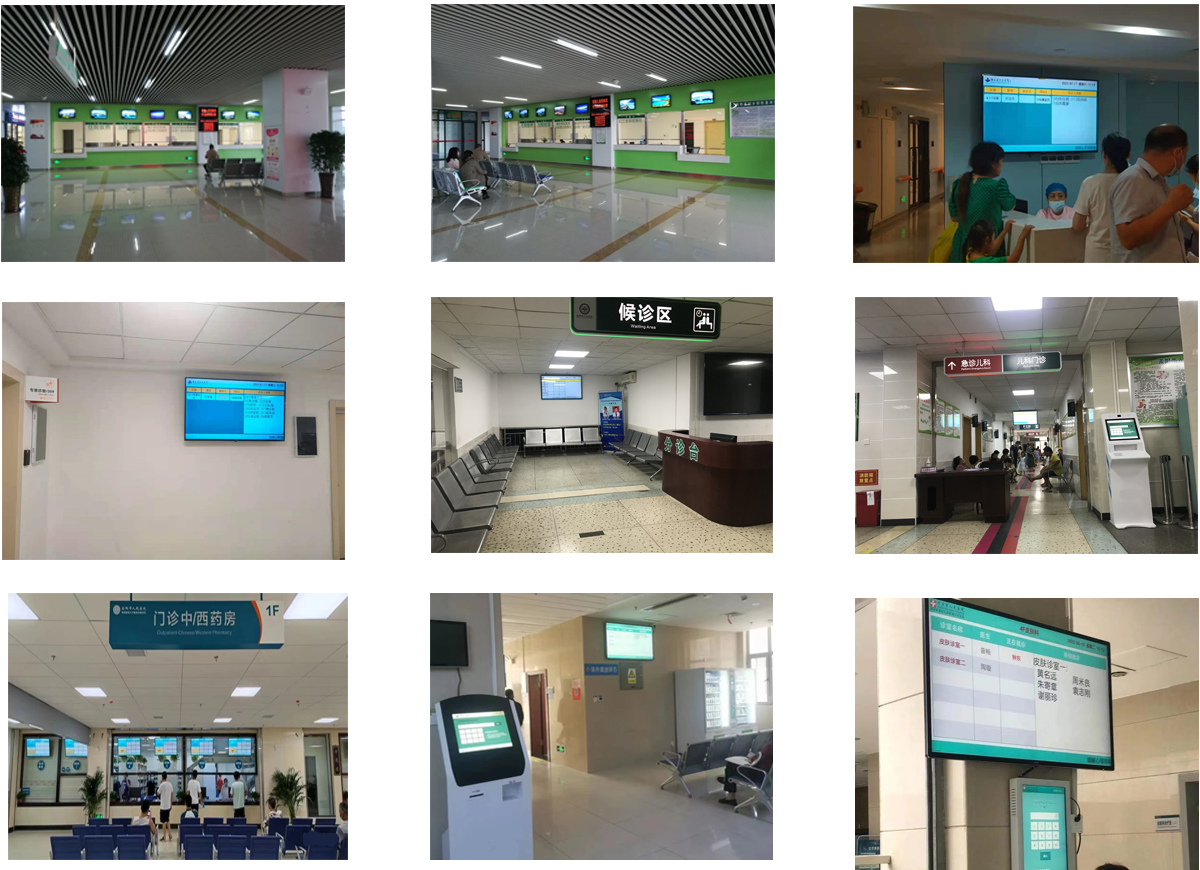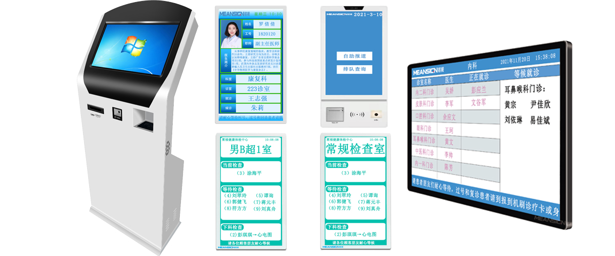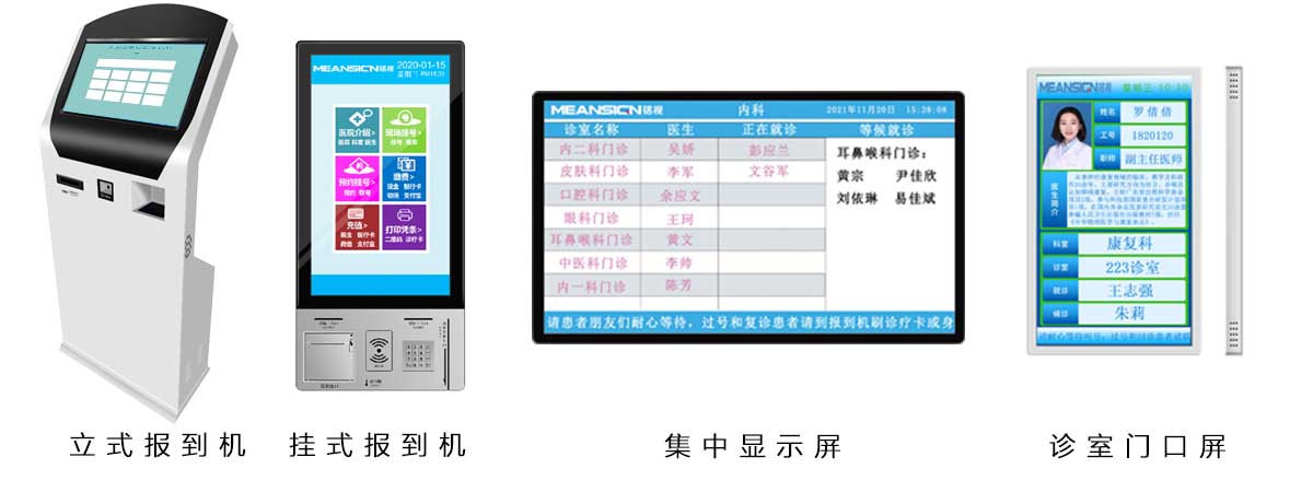 醫(yī)療叫號系統(tǒng)所使用的硬件設(shè)備包括:自助報到機(jī)、診室門口屏、集中顯示屏、醫(yī)生排班顯示屏、自助取單機(jī)等,其中診室門口屏有15.6、18.5、21.5、23、27等尺寸,集中顯示屏有32、43、49、55、65、75、85、100等尺寸,報到機(jī)支持壁掛和立式兩種,可增加二維碼掃描模塊、小票打印機(jī)模塊、刷卡模塊、身份證識別模塊、攝像頭模塊等外設(shè)。